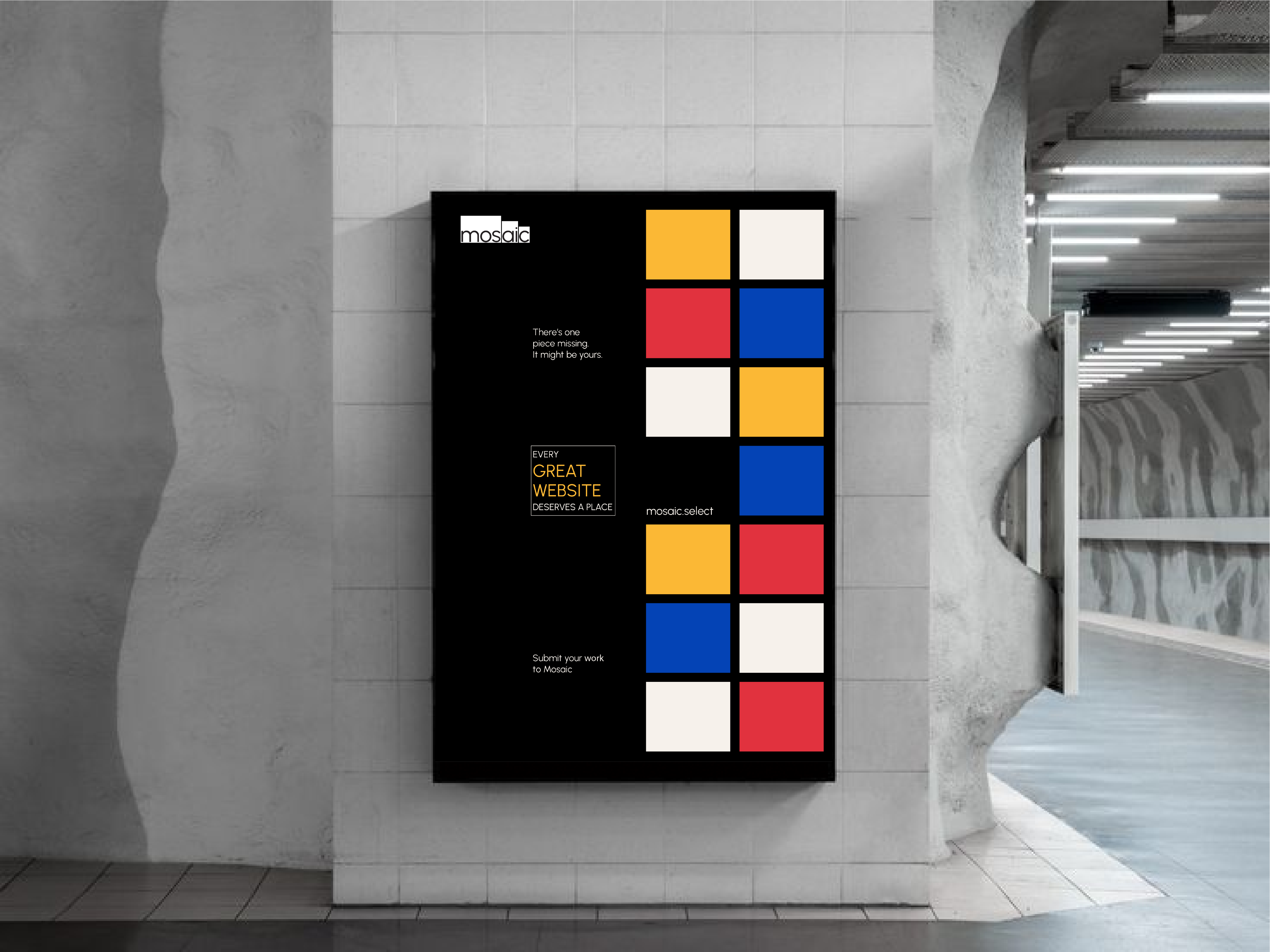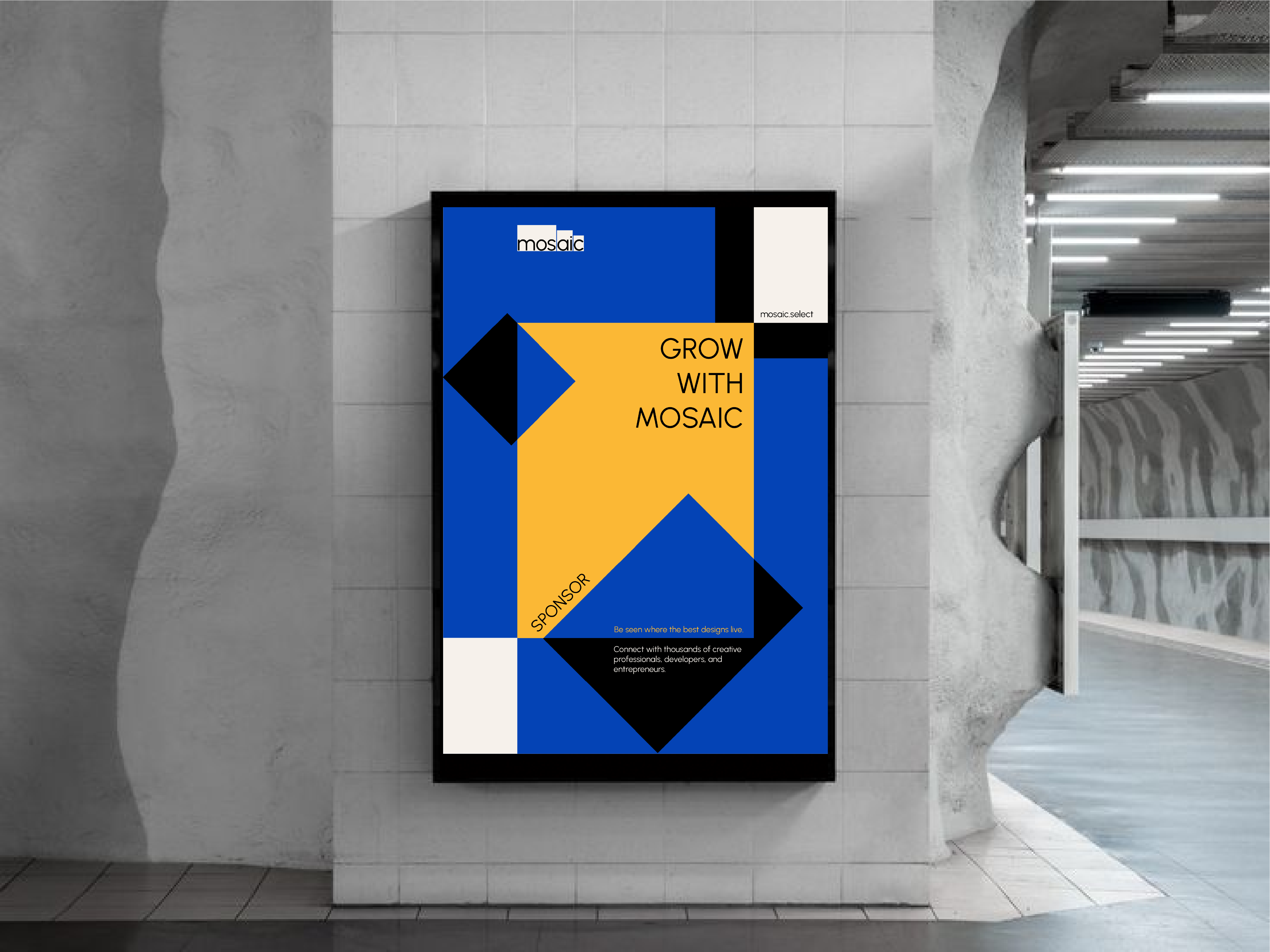 The Mosaic logo draws its form from the three fundamental viewports of the modern web: desktop, tablet, and mobile. Each screen size is abstracted into a simple geometric rectangle, arranged together in a tight, unified composition that mirrors the very act of curating: distinct pieces assembled into a coherent whole.